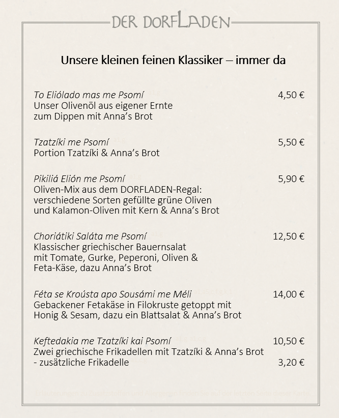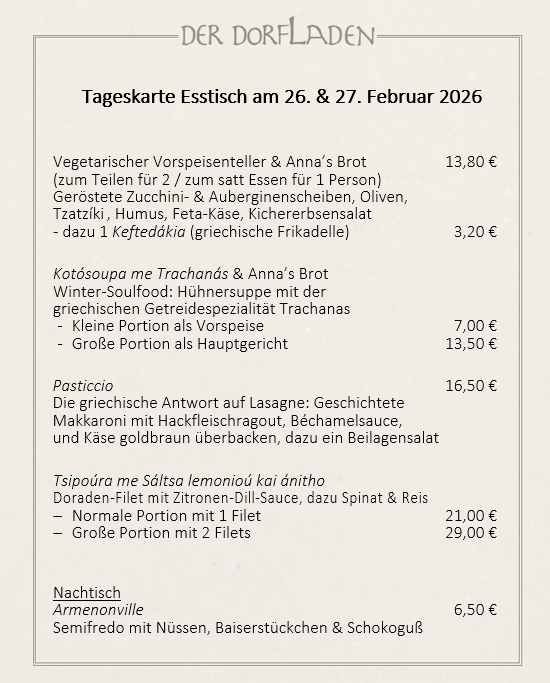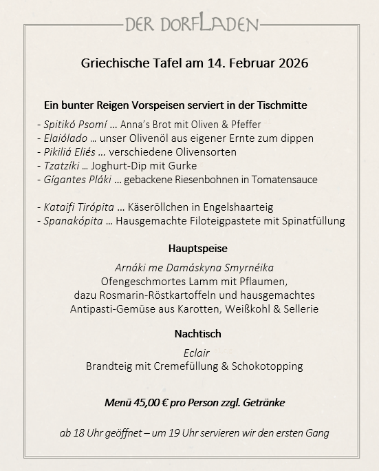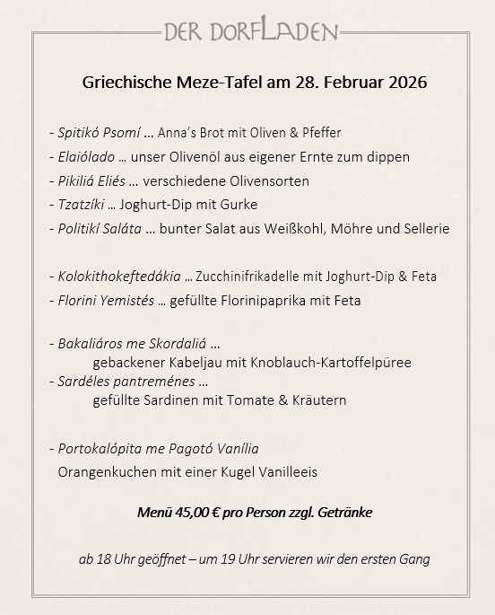 Sollte keine andere Uhrzeit angegeben sein, öffnen sich die Türen des DORFLADENs um 18:00 Uhr, damit Sie in aller Ruhe ankommen und gerne schon einen Aperitif genießen können.